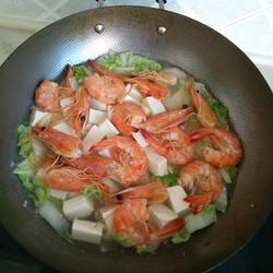 2. Blanch the shrimp slightly before the cabbage changes color slightly, add tofu, shrimp and water ! Separate the shrimp heads and shrimp parts!