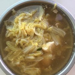 4. Put all the ingredients including green onion and ginger into the pot and stir-fry for three minutes.Pour in an appropriate amount of water, add salt, and simmer the chicken essence for twenty-five minutes.The cabbage is very tender