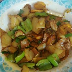 3. Again, fry the potato slices in oil in the pot, add chopped green onion, garlic, and other seasonings, add radish slices, fry for a while and add pork.This principle is because radish is not easy to cook.It's cooked, so cook it for a long time, but the meat will get old easily if it's fried for a long time, and it won't be chewable.