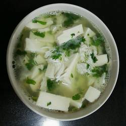 6.Pour the tofu cut into small pieces into the pot, add appropriate amount of salt, and turn to high heat After it boils, add the chopped shepherd's purse and turn off the heat.
