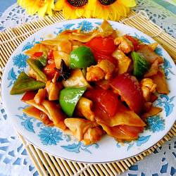 Tip: interview in advance and be patient enough Let the chicken legs rest until they are tender.No need to add starch (chicken breasts taste bad when cooked).Use aniseed oil to sauté the shredded ginger and garlic until fragrant.The taste will be better (this step saves work).Add the chicken pieces in turn, followed by the onions and green peppers., the tomatoes are easy to rot at the end, and the noodles are cooked twice in cold water in advance, so that they are not sticky when fried.The recipe is for reference