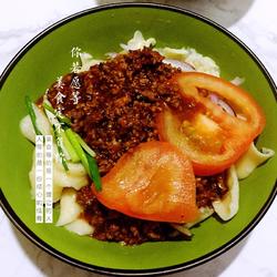 7.Put the noodles into a bowl, add onions and green onion segments, and cover with sauce , put two slices of tomatoes and serve.It is best to put green vegetables.