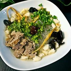 21. Half a bowl of water, half a bowl of mutton soup, add a few fungus, chopped day lily, add salt to the steamed bun , pepper to taste, and let the soup boil for 3 minutes