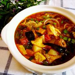 5. Put some oil in the pot, simmer the ginger and vinegar Pour water into the pot and bring to a boil.Pour in the vegetarian and meat sauce you just made.After boiling for about five minutes, add the chicken essence and sprinkle with pickled vegetables (leeks, diamond-shaped egg skins)