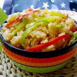 10.Then add the green and red pepper shreds and stir-fry slightly