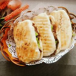 16. Cut the pancake in the middle and add beef, green pepper, and some braised beef juice!