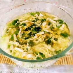 5.After it boils, add the coriander after two minutes, then mash the eggs and mix well and pour in! Boil, serve, drizzle with sesame oil and it’s ready!