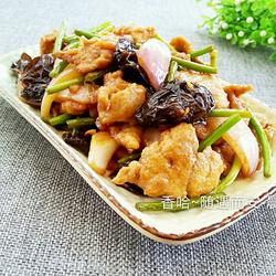 4.Pinch off the head and tail of the garlic sprouts, wash and cut into sections of about five centimeters; slice the onion; Wash the fungus after soaking