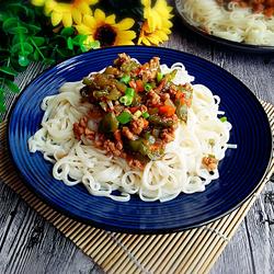 12. Put the noodles on a plate, put pork and green pepper marinade on top, and mix well when eating