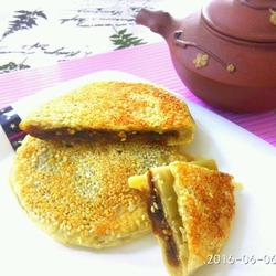 12.Put oil in the pan (the remaining oil will be used to pancakes).Place the cake with the sesame side down in a pan and bake over slow heat (lowest heat on the gas stove).If the fire is high, the outside will be burnt and the inside will be uncooked.If the pot is larger and the fire is more even, you can bake three to four cakes at the same time, and rotate the cakes 180 degrees in place after a while.This way the fire is more even.After about three to four minutes, if the crust turns golden brown and the top is slightly bulging, you can turn the crust over and cook the other side.It will turn golden brown in about two to three minutes, and it’s ready!
