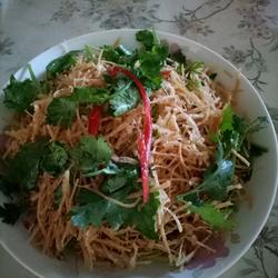 2. Cut the coriander into sections, shred the red pepper, mince the garlic slices, and put them in a bowl