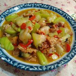 1. Prepare the ingredients, peel the melon, peel the garlic, and chop the red pepper! Cut the fat side of the pork and the lean side, set aside!