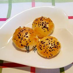 9. Line a baking sheet with oiled paper, and roll the sugar-wrapped dough into a 0.2 cm shape.Place the round cake on a baking sheet, brush with egg wash and sprinkle with black sesame seeds.