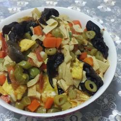 The tofu skin can be replaced with cubes of tofu, and diced mushrooms can also be added.
