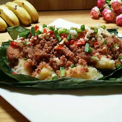 6. Cut potatoes into hob pieces, add a little salt and mix well, sprinkle with a thin layer of steamed pork rice noodles, spread on brown leaves