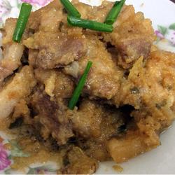 7. Add the ground rice noodles to the marinated meat, stir evenly, and steam in a pressure cooker over high heat 10 minutes will do.