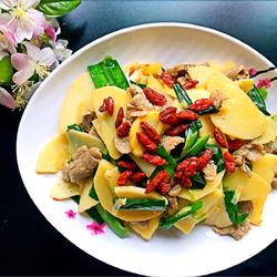 11. Add the spring bamboo shoots and continue to fry for about 2 minutes.