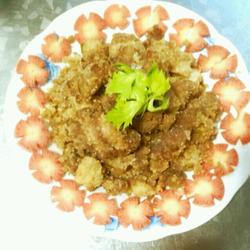 3. Pour the submerged meat slices into cooking oil and mix well.Add the cut potato slices and mix well.Then add flour, mix well and steam 1 Hour.