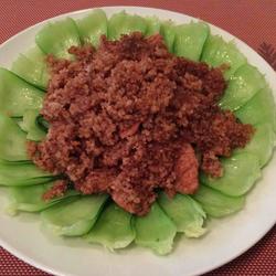 2. Slice lean meat and soak in a little water for about 10 minutes.Drain the water slightly, coat each piece with dry powder, spread it flat on a plate, sprinkle an appropriate amount of sauce, and steam it in a steamer for 20 minutes.stand-by.