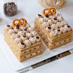 17.Stack the cake slices one by one until all the cake slices are used up, squeeze a layer of cream on top, and put coffee beans and biscuits on top.Yes