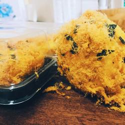 13.Wear disposable gloves, place the cake in the meat floss, roll it in the meat floss, and take it out
