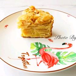 6.Prepare a 6-inch cake mold, stack the apple slices in the mold, spread the remaining cake batter evenly in the mold, and finally sprinkle some almond slices on top.Place the baking sheet into the middle rack of the oven and bake at 170℃ for about 50 minutes