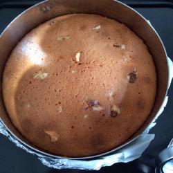 3. Pour in the low-gluten flour in three to four times, and use a rubber spatula to carefully start from the bottom.Stir until the egg batter and flour are evenly mixed.Do not stir in circles to prevent the eggs from defoaming.Pour vegetable oil or melted butter into the mixed cake batter, and continue to mix evenly.Sprinkle with walnuts.Finally, pour all the mixed cake batter into the cake mold.