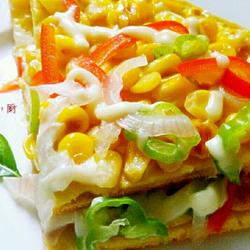 6. Gently spread corn kernels, red peppers, green peppers, onions, and cheese shreds on the egg batter, and finally sprinkle 1 gram of salt evenly