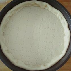 3.Put the crust into a pizza pan with greased walls, fold up the edges as shown, and poke holes in the bottom of the crust , ferment until doubled in size, put in the oven and preheat 190℃ for five minutes, then add stuffing and bake or refrigerate for ready use