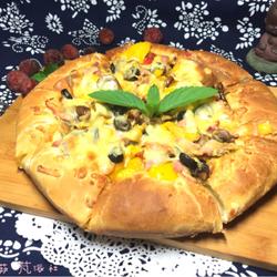 9. Spread a layer of tomato sauce, sprinkle with pizza grass, top with bell peppers and bacon, Corn kernels, black olives.