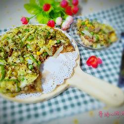 1. Prepare the ingredients.Pizza crust, green peppers, onions, beef, shrimp, corn kernels, pea kernels, mozzarella cheese.
