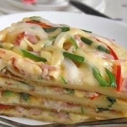 1.【Pizza quiche】 1.Cut the bacon, onion, green and red pepper into thin strips, and cut the chives into sections; 2.Put the eggs in a bowl, add salt and mix well, add a little flour and mix into a grain-free egg paste; 3.Brush a non-stick pan with a thin layer of oil, lower the heat, and add Egg batter, turn off the heat after 40 seconds; 4.Spread bacon shreds on the egg batter, then green and red pepper, onion shreds, and finally cheese shreds; 5.Cover, simmer on low heat for 3 minutes, open the lid, and add cheese sticks Melt, shake the pan gently, and the cake will come out of the pan.