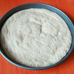 8. Grease the pizza pan and carefully place the rolled dough into it.Use a fork or toothpick to poke all the holes.