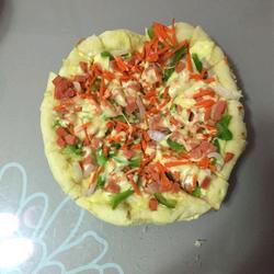 3. Cut onions, ham, carrots, green and red peppers into bites and sprinkle them in turn, then sprinkle with shredded cheese.Cover and bake over low heat for 7.8 minutes.