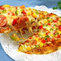 7. Preheat the oven to 180 degrees, place the pizza dough in the middle of the oven and heat for five seconds Minutes, take it out.Spread the fried pizza sauce, sprinkle with a layer of mozzarella cheese, and top with ham, corn kernels, colored peppers, and green peppers.