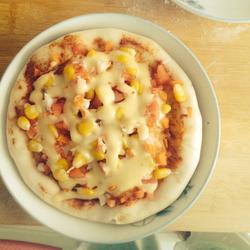 5.Put the prepared ingredients on the cake and bake it in the pan.