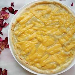 9. Take out the baked cake and spread the durian meat evenly on the crust.