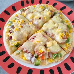 The pizza base is a semi-finished product , take it out and use it directly.The barbecue I used happened to be available at home.