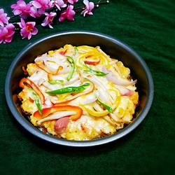 13.Pour the steamed buns into the pan, spread them flat, and spread a layer of tomato sauce.