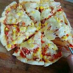 3.Mix fresh yeast and one egg into dough, make a pizza, pierce it with a fork, and fry Pour the prepared pizza sauce into the pie