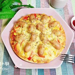 1. Prepare the ingredients.QQ sausage, sweet corn, red pepper, shredded cheese, pizza base, pizza grass, tomato sauce.