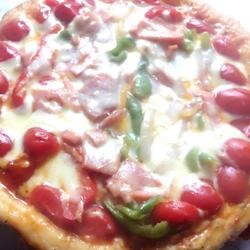12. Place onions, green and red peppers, cut bacon into small slices, cut ham into small strips and place on top.Cut cherry tomatoes in half, place them in a circle, and sprinkle with shredded cheese.Cheese is cheese.