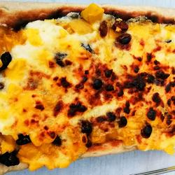 7. Add the remaining durian cream, mango, and grape dices, and finally apply a layer of cheese and put it in the oven (oven temperature 180 degrees )