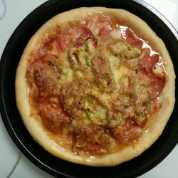 3.Put the shrimp meat, Put ham sausage and green pepper into the pizza crust, then sprinkle with mozzarella cheese, then add ham sausage, green pepper, and sprinkle with mozzarella cheese on top
