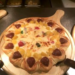 2. Make a lace, put the jam, 40g of cheese, and arrange various fruits evenly.