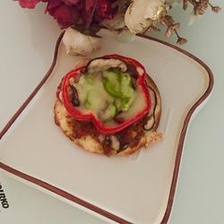 6.Put on the red bell pepper rings and garnish with a little green Shred the bell pepper, put it into the preheated oven, bake it for 10 minutes, take it out and sprinkle it with a layer of shredded cheese, then put it in the oven and bake it for 5 minutes