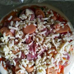 3. First apply a layer of pizza sauce, then spread a layer of shredded cheese, and then Add the ingredients one by one, and finally add a layer of shredded cheese, you can add more!