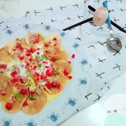 5.On the original basis, evenly sprinkle red pepper, red pepper, onion, bacon, Ham.