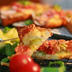 4. Put shredded cheese, green pepper cubes, chicken breast, red sausage, Cherry tomato.Then sprinkle some powdered sugar on top and sprinkle a thin layer of shredded cheese.