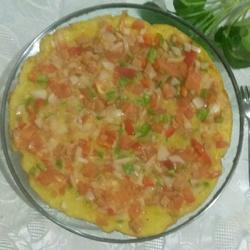 Flour, cornmeal, eggs, red peppers, green peppers, tomatoes, ham, onions ( 100 grams each of flour and cornmeal, two eggs and the rest ) | Oil, salt, tomato paste ( appropriate amount ) |